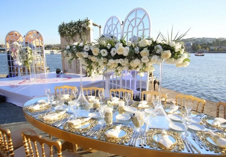Eski dönemlere ait sarayların ve köşklerin duvarlarında altın sarısı detaylara çok fazla rastlıyoruz. Durum böyle olunca mekanlar davet alanını boğmamak için masa ve sandalye giydirmelerini beyaz kumaşlarla yapıyorlar. Konseptte kullanılan aksesuarların bazılarına yapılan minik altın sarısı dokunuşlarla da alan ve dekorasyon uyumunu yakalamış oluyorlar. Özellikle gold şamdanlar çok tercih ediliyor.