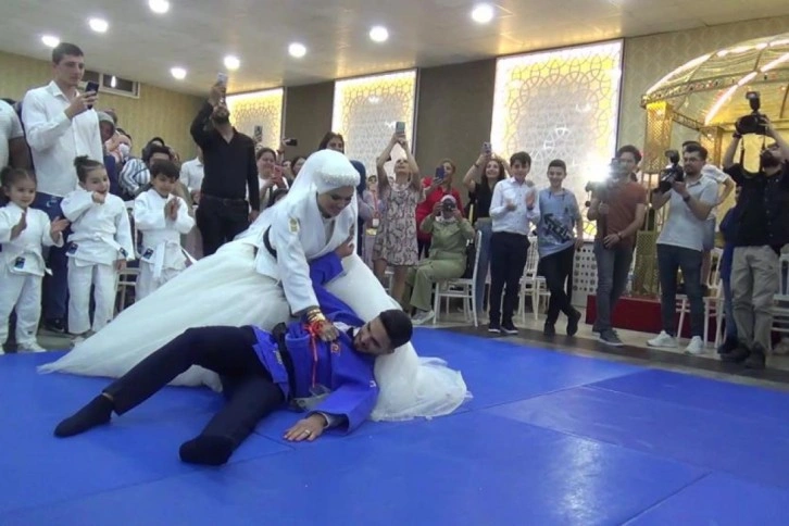 Judo antrenörlüğü yapan siyah kuşak sahibi gelin ile damat nikah öncesi judo kıyafeti giyerek gösteri yaptı. Gösteride gelin, damadı yerden yere vurarak unutulmaz anların yaşanmasına neden oldu.Denizli'nin Merkezefendi ilçesinde uzun süre hafızalardan silinmeyecek bir nikaha imza atıldı. Denizli Büyükşehir Belediyesporlu siyah kuşak sahibi Judo antrenörleri Ümran Şahbal ve Talha Enes Arıoğlu, düzenlenen törenle dünya evine girdi. Aynı kulüpte spor yaparak tanışan 23 yaşındaki çift, 2013 yılından bu yana olan beraberliklerini nikahla taçlandırdı. Denizli protokolün de çağırıldığı nikah öncesi gelin ve damat salondakilere bir sürpriz yaptı. Damatlık ve gelinliklerinin üzerlerine judo kıyafeti giyen genç çift, kurulan minder üzerinde judo gösterisi yaptı. Gelinin damadı yerden yere vurarak yaptığı gösteri salondakilerin ilgi odağı olurken, unutulmayacak görüntüler ortaya koydu. Mini gösterinin ardından Denizli Büyükşehir Belediye Başkanı Osman Zolan'ın kıydığı nikahla genç çift bir ömür boyu mutluluğa ‘evet' derken törenin ardından tebrikleri kabul etti.
