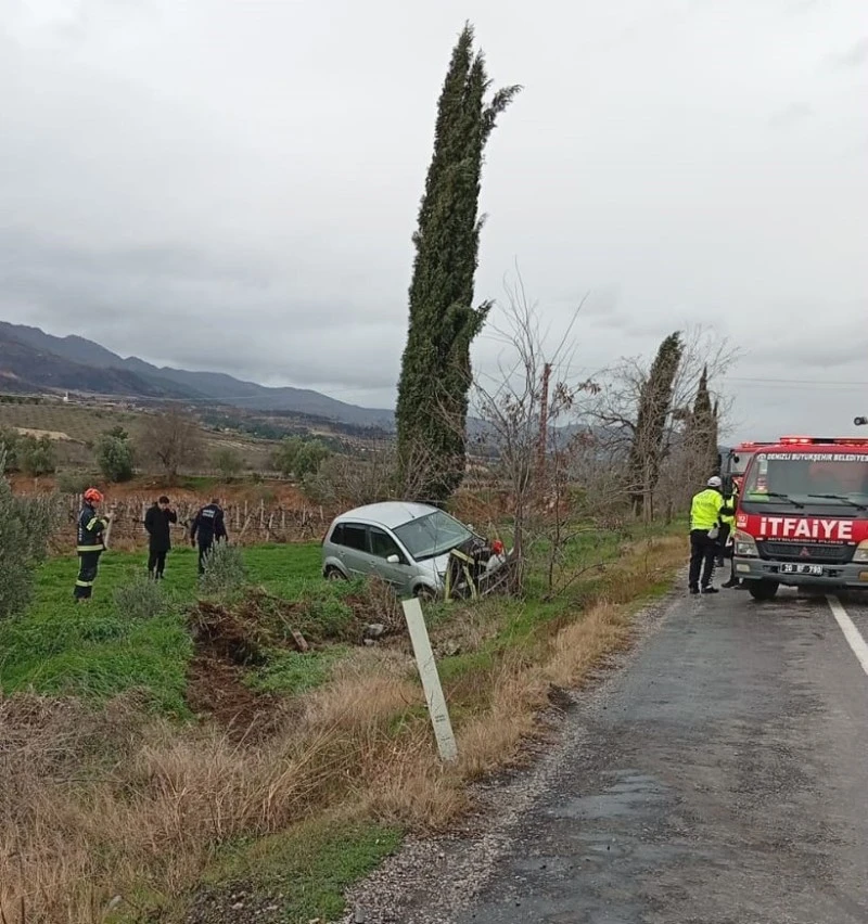 Denizli’nin Buldan ilçesinde 20 ADR 254 plakalı otomobil, yağmur yağışıyla kayganlaşan yolda sürücüsü M. S.’nin direksiyon hâkimiyetini kaybetmesi sonucu kontrolden çıkarak üzüm bağına uçtu. Kazada can kaybı ve yaralanma yaşanmazken, otomobilde ağır maddi hasar meydana geldi.