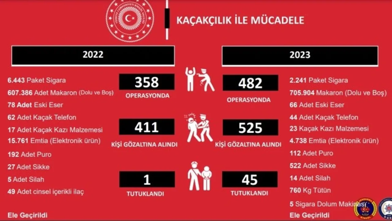 Bingöl’de 2023 yılında kaçakçılıkla mücadele kapsamında yapılan 482 operasyonda, 525 kişi gözaltına alınırken, 45 kişi tutuklandı.Bingöl’de 2022 ve 2023 asayiş faaliyetlerinin verileri açıklandı. Açıklanan verilere göre, İl Emniyet Müdürlüğü ve İl Jandarma Komutanlığı koordinesinde yürütülen kaçakçılık ile mücadele faaliyetleri kapsamında 2023 yılında 482 operasyon gerçekleştirildi. Bu operasyonlarda 2 bin 241 paket sigara, 705 bin 904 makaron (dolu ve boş), 66 Adet eski eser, 44 Adet kaçak telefon, 23 kaçak kazı malzemesi, 4.738 emtia (elektronik ürün), 112 adet puro, 522 adet sikke, 14 adet silah, 760 kilo tütün ve 5 sigara dolum makinasının ele geçirildiği belirtildi.Gerçekleşen bu operasyonlarda ise 525 kişinin gözaltına alındığı, 45 kişinin tutuklandığı bildirildi.2022 yılında gerçekleşen operasyonlarİl Emniyet Müdürlüğü ve İl Jandarma Komutanlığı koordinesinde yürütülen kaçakçılık ile mücadele faaliyetleri kapsamında 2022 yılında 358 operasyon gerçekleştirildi. Bu operasyonlarda, 6 bin 443 paket sigara, 607 bin 386 adet makaron (dolu ve boş), 78 adet eski eser, 62 adet kaçak telefon, 17 adet kaçak kazı malzemesi, 15.761 emtia (elektronik ürün), 192 adet puro, 27 adet sikke, 5 adet silah ve 49 adet cinsel içerikli ilaç ele geçirildi.