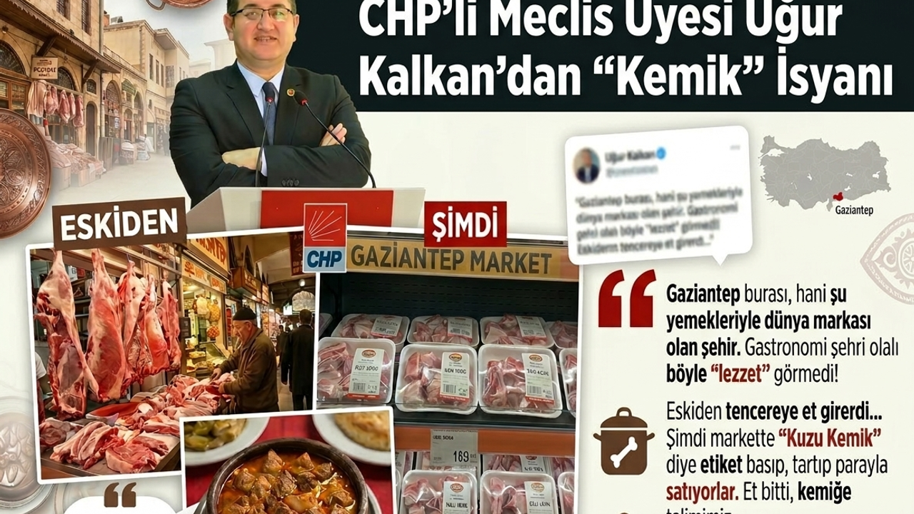 Market raflarındaki "Kuzu Kemik" etiketli paketlerin artık lüks bir yemek malzemesi haline geldiğini belirten Uğur Kalkan, vatandaşın et yerine et tadı alabilmek için kemiğe yönelmek zorunda kaldığını vurguladı. Açıklamasında, "Bu kemik hayvanlara değil, insanlar çorba yapıp et tadı alsın diye satılıyor. Şaka değil, Gaziantep'te et bitti, kemiğe talimimiz başladı. Yazık" ifadelerine yer verdi.