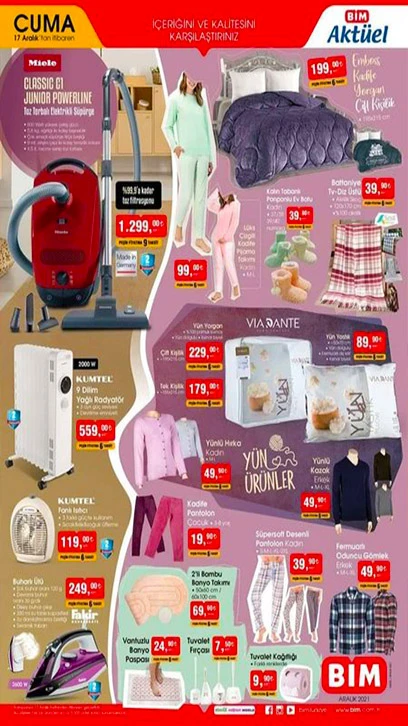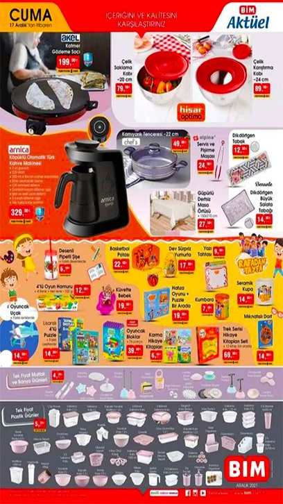 17 Aralık BİM aktüel ürünler kataloğu bugün satışa çıktı. BİM'de indirimli ürünlerden faydalanmak isteyen vatandaşlar için; Kumtel Fanlı Isıtıcı, Elektrikli Süpürge, Arnica Türk Kahve Makinesi, Elektrikli Katmer ve Gözleme Sacı uygun fiyatlarla raflardaki yerlerini aldı. İşte BİM kataloğu