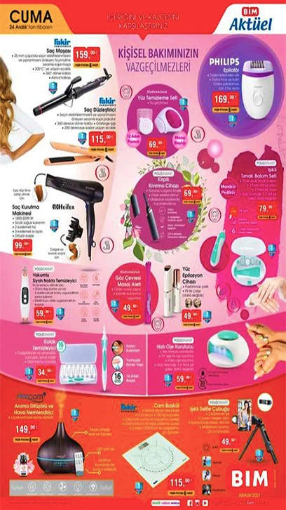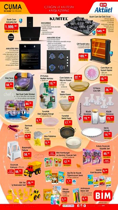 24 Aralık 2021 BİM Aktüel ürünler kataloğu satışa çıkıyor. BİM'de bu cuma; Kumtel Siyah Cam Ankastre Set, Fakir Saç Maşası, Saç Kurutma Makinesi, Mini Hamburger ve Sandaviç seti ve Phılıps Epilatör ve gıda ürünlerinde birçok indirimli fiyat yer alıyor. İşte, BİM indirimli ürünler listesi...