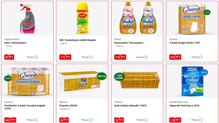 BİM'de bu Salı temizlik ürünlerinde başlıca; Marc Mutfak-Banyo Temizleyici Sprey 750 ml 11,90 TL'den alıcısı ile buluşacakken, Işıl Mutfak Sıvı Sabunu 400 ml 5,90 TL'den, Aks Yüzey Temizleyici 750 ml 3,25 TL'den satılacak.