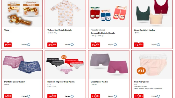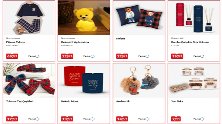 BİM kataloğundaki bujiteri ve bebeklerr için hazırlanan ürünlerde ise Toka ve Taç Çeşitleri 12,90 TL, Kadın Çorap Çeşitleri 19,90 TL, Kız – Erkek Bebek Tulum 34,90 TL, Değişik bedenlerde Naturalove Pijama Takımı 69,90 TL fiyatıyla kadın müşterilerin alımına sunulacak.