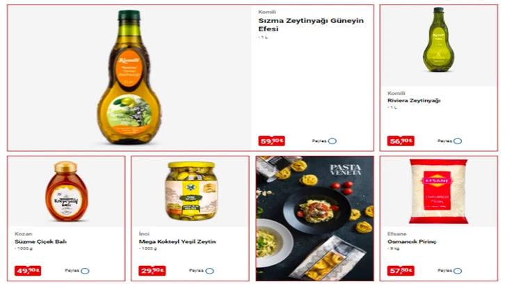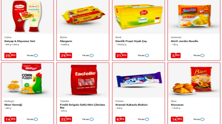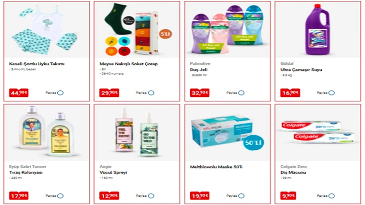 TL, Palmolive 2×500 ml Duş Jeli 32,90 TL, Eyüp Sabri 250 ml Tıraş Kolonyası 17,90 TL, Colgate Zero 98 ml Diş Macunu 9,90 TL, Meltblownlu 50'li Maske 19,90 TL, Güldal 2,5 Kg Ultra Çamaşır Suyu 16,90 TL'den satılacak.