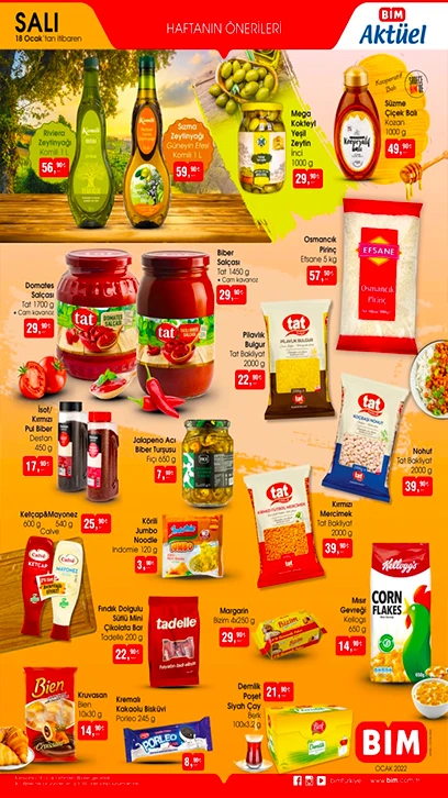 BİM 18 Ocak 2022 aktüel ürünler kataloğundaki temel ihtiyaç grubunda Bien 10×30 gr Kruvasan 14,90 TL. Bizim 4×250 gr Margarin 29,90 TL. Tat 2000 gr Bakliyat Nohut 39,90 TL. Efsane 5 Kg Osmancık Pirinç 57,50 TL. Kellogg's 650 gr Mısır Gevreği 14,90 TL. Komili Riviera 1 Litre Zeytinyağı 56,90 TL. Kozan 1000 gr Süzme Çiçek Balı 49,90 TL. Tat 2000 gr Bakliyat Pilavlık Bulgur 29,90 TL. Indomie 120 gr Körili Jumbo Noodle 3,90 TL. Destan 450 gr İsot – Kırmızı Pul Biber 17,90 TL fiyatla satışa sunulacak.