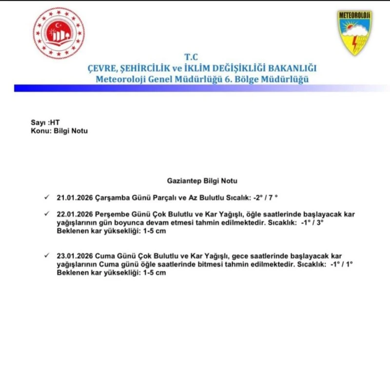 Gaizntep Valiliği sosyal medya hesabında yaptığı açıklamada; "Meteorolojik verilere göre önümüzdeki Perşembe günü öğle saatlerinde başlayacak kar yağışının gün boyunca, Cuma günü gece saatlerinde başlayacak kar yağışının ise Cuma öğle saatlerine kadar devam etmesi beklenmektedir. Sıcaklıklar gece saatlerinde (-) derecelere düşeceğinden; Vatandaşlarımızın don, buzlanma ve trafikte yaşanan olumsuzluklar konusunda duyarlı olmasını rica ederiz" dedi.