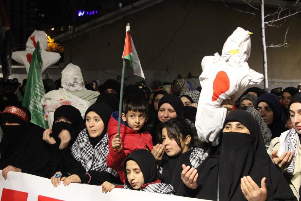 Soykırımcı İsrail'in saldırıları ile Filistinlilere yönelik idam yasasına tepki gösteren vatandaşlar, İsrail'in Gazze'deki bebek ve çocuk katliamlarına tepki gösterdi. Yürüyüşe katılan kadınlar, ellerinde temsili kanlı bebek maketleri taşıdı.
