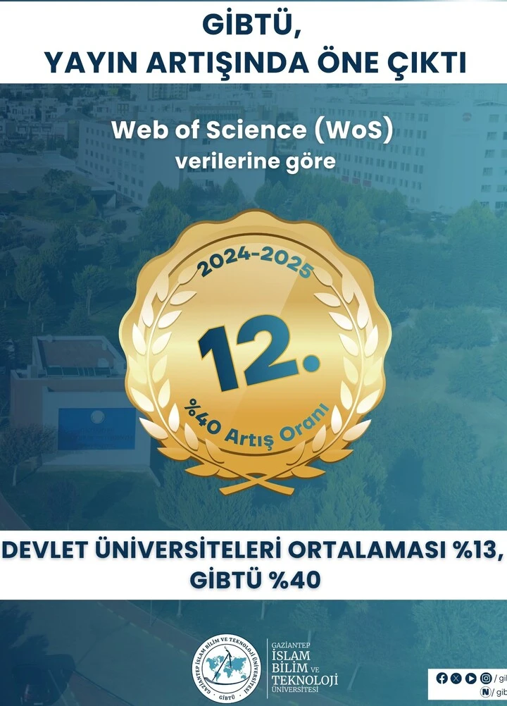 Devlet üniversiteleri genelinde ortalama yüzde 13 olarak gerçekleşen yayın artış oranının yaklaşık üç katına ulaşan bu performansla GİBTÜ, devlet üniversiteleri arasında yayın artışında 12. sırada yer aldı. GİBTÜ Rektörü Prof. Dr. Şehmus Demir, "Uluslararası indeksli dergilerdeki görünürlüğün artırılması, üniversitemizin bilimsel üretkenliğini güçlendirmek ve toplumun ihtiyaçlarına çözüm üretmek adına kritik bir adımdır" dedi.GİBTÜ, uluslararası indeksli dergilerde yer alan yayın performansında son yıllarda kaydettiği istikrarlı artışla dikkat çekiyor. Web of Science (WoS) verileri üzerinden yapılan değerlendirmelerde GİBTÜ, 200 devlet ve vakıf üniversiteleri arasında 2022-2025 döneminde yayın sayısındaki yüzde 324’lük artış oranı ile deprem bölgesinde yer alan üniversiteler arasında 1. sırada yer aldı.GİBTÜ yüzde 81’lik artış ile birinci sırada