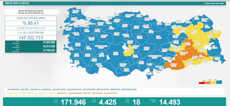 Sağlık Bakanlığı tarafından 15 Nisan koronavirüs tablosu, vaka, hasta, test, vefat sayısı ve son durum açıklandı. Yaklaşık 2 yıl sonra vefat sayısı 20'nin altına düştü.