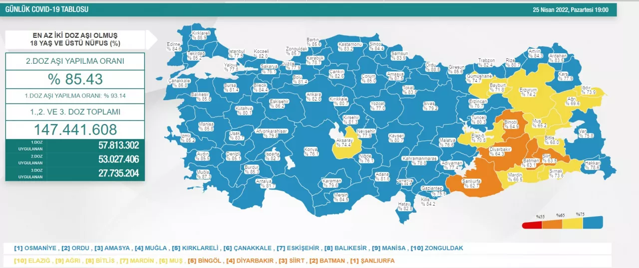 Bakanlığın tablosuna göre yüzde 62,7 ile Türkiye'de en az aşılamanın gerçekleştirildiği Şanlıurfa’yı sırasıyla Batman, Siirt, Diyarbakır, Bingöl, Muş, Mardin, Bitlis, Ağrı ve Elazığ takip etti.