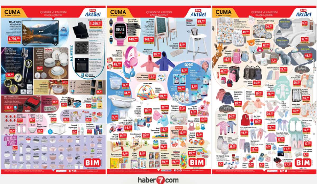 Haftanın BİM aktüel katalog ürünleri belli oldu. 23-26 Şubat 2021 tarihlerinden itibaren BİM marketlerinde indirimli olarak satışa sunulacak ürünlerin arasında; Elton 40" Full HD Uydu Alıcılı Led TV, Kumtel Cam Ankastre Set, Güral Porselen 18 Parça Rölfeyli Yemek Takımı, Dijital Yazı Tahtası, Dekorlu Dikdörtgen Dikey Tepsi, Dikdörtgen Multibox, Bilicra Akıllı Çocuk Saati, Ahşap Çift Taraflı Çocuk Yazı Tahtası, Pilsan Mama Sandalyesi, Mama Sandalyesi Minderi, Piccolo Mondi Bebek Aktivite Halısı, Wee Emzik, Sarkıt Tavan Lambası Çeşitleri, Ledli Gece Lambası Çeşitleri, KANZ Anne - Bebek Bakım Çantası, Uyku Tulumu ve çok daha fazla ürün satışa sunuldu. Peki BİM haftanın aktüel katalog ürünleri neler?