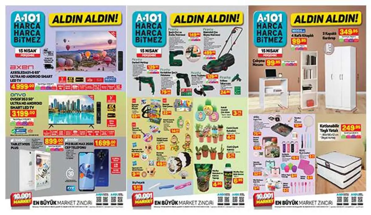 Her hafta olduğu gibi bu hafta da A101 aktüel kataloğu yine dopdolu. 15 Nisan 2021 tarihinden itibaren A101 marketlerinde birbirinden farklı ürünlerle tüm ihtiyaçlarınız karşılanacak. Haftanın A101 aktüel kataloğunda yer alan ürünlerin arasında en çok dikkat çekenleri; Xiaomi Redmi Powerbank 20.000 mAh, SEG Çamaşır Makinesi, SEG No-Frost Buzdolabı, Piranha Akıllı Saat Çeşitleri, Piranha Led Işıklı Stand, Gölgelikli Salıncak, Çalışma Masası, 3 Kapaklı Gardırop, Singer Expert Ütü, Katlanabilir Kamp Sandalyesi, 4 Kişilik Kamp Çadırı, Piranha Avuç Taşlama, Elektrikli Çim Biçme Makinesi. İşte A101'in tüm ürünleri ve fiyatları...