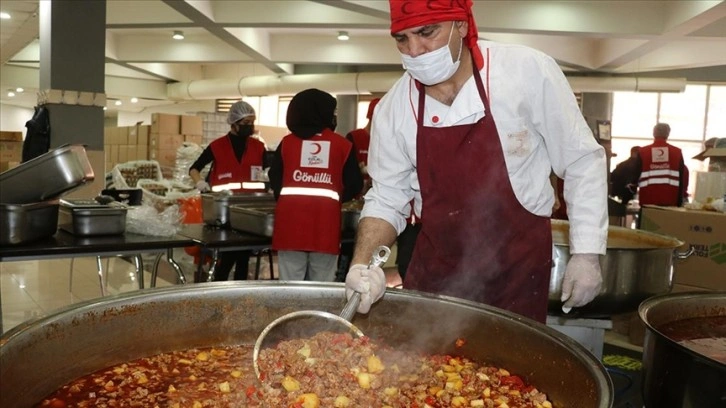 Onlarca kazanda Kızılay personeli ve gönüllülerin desteğiyle yapılan çeşitli yemekler, çadır ve konteyner kentlerde kalan depremzedelere ulaştırılıyor.