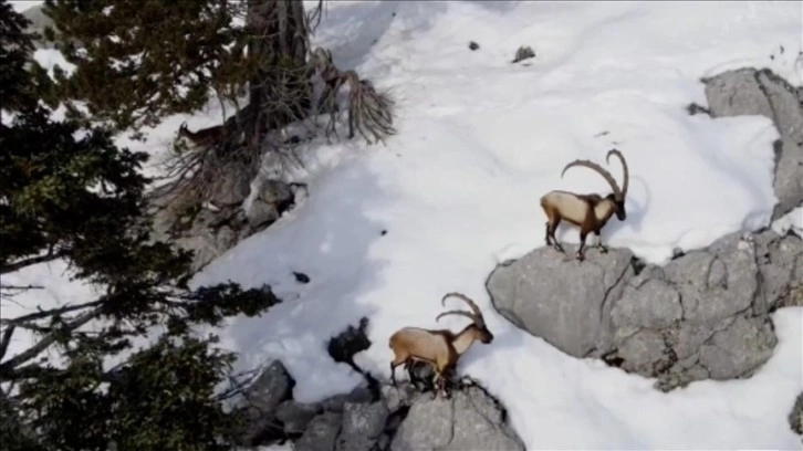 Görüntülerde, yaban keçilerinin dağların zirvesinde ve sarp kayalıklar arasında gezinmesi yer aldı.