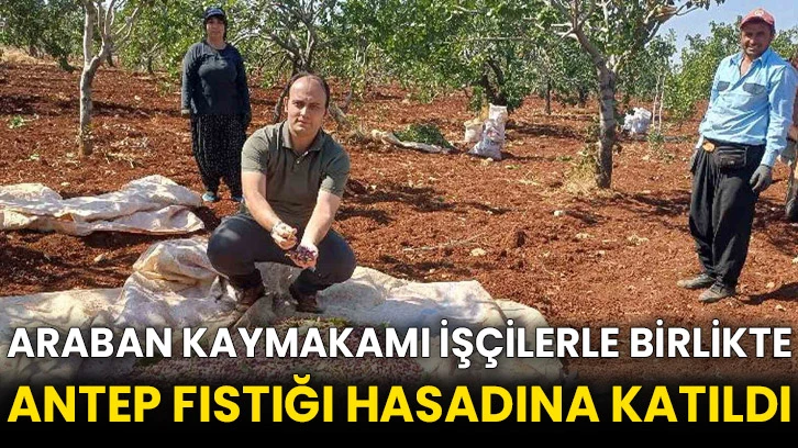 Antep fıstğı hasadında Kaymakam İşçimen’e Araban Ziraat Odası Başkanı Hasan Altun, Tarım ve Orman İlçe Müdürü Kerim Yavuz, İlçe Jandarma Komutanı Üsteğmen Servet Arslan ve İlçe Emniyet Amiri Komiser Metin Kızılkaya da katıldı.