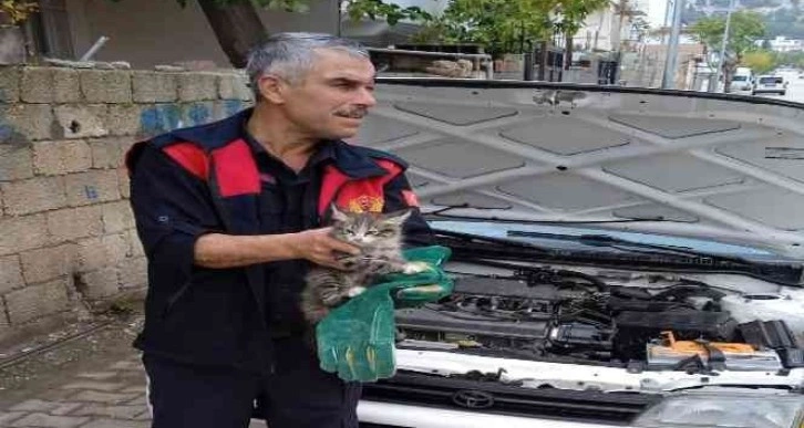 Adıyaman'da, park halindeki otomobilin motor kısmına sıkışan kedi, itfaiye ekiplerince kurtarıldı.