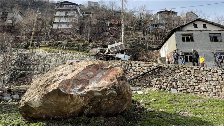 Merkeze bağlı Dere Mahallesi'nde kar sularının erimesi ve yağmur nedeniyle yamaçtan kopan kaya kütlesi, bölgedeki 4 evin arasından yuvarlanarak tarım arazisine düştü.