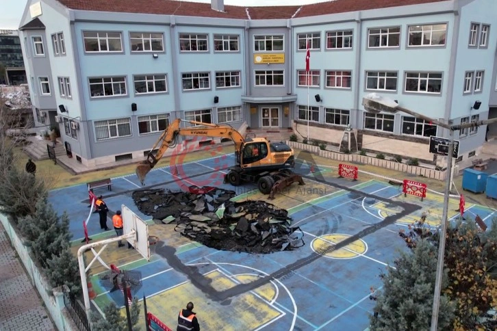 Belediye ekipleri bu sabah gelerek öğrenciler dersteyken bahçeyi kepçeyle kazarak alanı düzeltme çalışması yaptı. Öğrenciler ise derslerini bırakıp bahçede yapılan çalışmayı izledi. Okul bahçesinde meydana gelen çökme ise dron ile havadan görüntülendi. Görüntülerde, çökmenin olduğu ve alanın çevrildiği yerde öğrencilerin top oynadığı ve ders saatinde ekiplerin çalışmasını camlara çıkarak izledikleri görüldü.