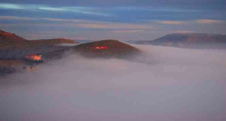 Batman'ın Kozluk ilçesinde oluşan yoğun sis bulutu, Dua Tepes'indeki bayrak ile bütünleşince seyrine doyum olmayan bir görüntü oluştu.