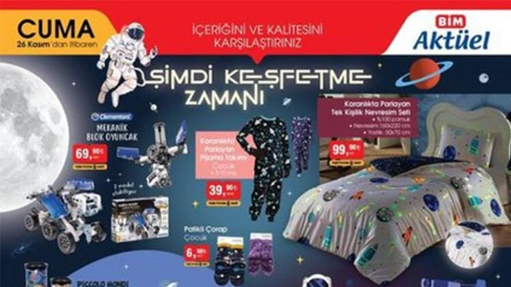 BİM 26 Kasım 2021 aktüel ürünler kataloğunda; Teleskop, Mikroskop, Fakir Filtre Kahve Makinesi, Telefon ve Tablet Standı, Nostaljik Radyo, Dresuar, Kadın Kadife Düğmeli Takım, Kumtel Dikey Isıtıcı, Soley Lüks Emboss Battaniye, Letoon Erkek Sukuba Takım, Soley Kurulama Havlusu 3'lü, Viadante Antibakteriyel Çift Kişilik Yorgan, Duşakabin Şampuanlık, Tefal Krep Tavası, 2022 Ajandası ve çok daha fazlası satışa sunuluyor.