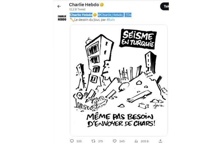 Merkez üssü Kahramanmaraş olan 7.7 ve 7.6 büyüklüğündeki depremler Türkiye'nin 10 şehrinde ve Suriye'de binlerce insanın ölümüne neden oldu. Türkiye tüm kurumları ve halk desteği ile deprem için seferber olurken tüm dünyadan da destek mesajları yağdı. Daha önce Müslümanların inançlarına hakaret eden karikatürler yayınlayan Fransız Charlie Hebdo dergisi ise depremle alay ederek provokatif bir karikatürü 'Günün çizimi' olarak yayınladı. İnsanlıktan ve vicdandan uzak çizimde, yıkık binalar resmedilerek 'Türkiye depremi' ibaresine yer verildi ve yorum olarak " Tank göndermeye bile gerek yok" yazıldı. Küstah karikatür derginin Twitter hesabından da yayınlandı.