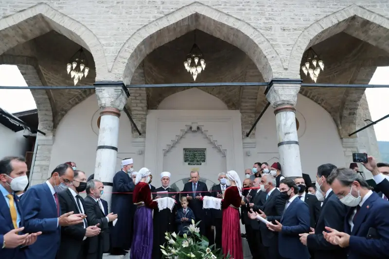 Cumhurbaşkanı Recep Tayyip Erdoğan, Bosna Hersek'in başkenti Saraybosna'da temaslarını sürdürüyor. İlk olarak Aliya İzzetbegoviç'in kabrini ziyaret eden Erdoğan, ardından cuma namazını kılmak üzere Başçarşı Camii'nin bulunduğu Başçarşı'ya geldi. Cumhurbaşkanı Erdoğan, Vakıflar Genel Müdürlüğünce restore edilen ve açılışı korona virüs salgını nedeniyle ertelenen Başçarşı Camii'nin resmi açılışını gerçekleştirdi. Açılışta konuşan Erdoğan, “Cuma namazını kıldığımız Başçarşı Camimimizin Bosna Hersek ve alemi İslam için hayırlara vesile olmasını diliyorum. 1527 yılında Saraybosna'nın merkezi olan Başçarşı meydanında inşa edilen bu abidevi eser, aradan geçen 5 asırlık sürede yangınlar, savaşlar, yıkımlar görmüştür. Camimiz en son ve ağır darbeyi 1992-1995 yıllarındaki savaş sırasında almıştır. Savaşta caminin kubbesinde, minaresinde, dış duvarları ve iç mekanında ciddi tahribat olmuştur. Savaştan sonra caminin kullanıma açılabilmesi için acil ihtiyaçlara yönelik bir tamirat yapılmıştır” dedi.