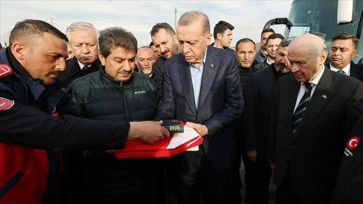 Bayrağı ve Kur'an-ı Kerim'i teslim alan Erdoğan, hayatını kaybedenlere rahmet diledi.