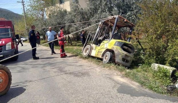 Olay bugün saat 13.00 sıralarında Fethiye'nin Karaçulha Mahallesinde meydana geldi. Mehmet Göven yönetimindeki forklift, yol kenarındaki zeytinliğe devrildi. Çevredekilerin 112 Acil Çağrı Merkezi'ne ihbarı üzerine olay yerine itfaiye, sağlık ve polis ekipleri sevk edildi. İtfaiye görevlileri ve vatandaşlar tarafından kaldırılan 4,5 ton ağırlığındaki forkliftin altında kalan genç operatörün olay yerinde yaşamını yitirdiği belirlendi.
