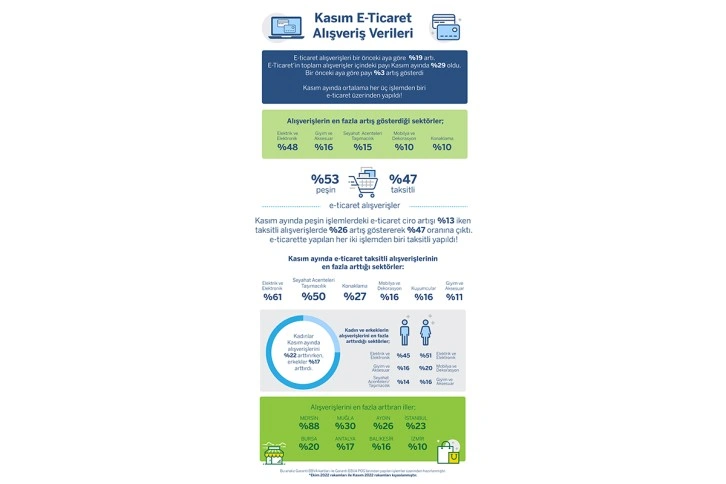 Cazip kampanyalarla birlikte ihtiyaçlarını taksitle karşılayıp Kasım ayı fırsatlarından yararlananlar, taksitli e-ticaret alışverişlerinde de en fazla Elektrik-Elektronik sektörünü tercih etti. Bu dönemde teknoloji ürünlerindeki taksitli alışverişler önceki aya göre yüzde 61 arttı. Taksitli e-ticaret alışverişlerinde Seyahat Acenteleri ve Taşımacılık yüzde 50, Konaklama ise yüzde 27 artışla Elektrik-Elektronik sektörünü takip etti.