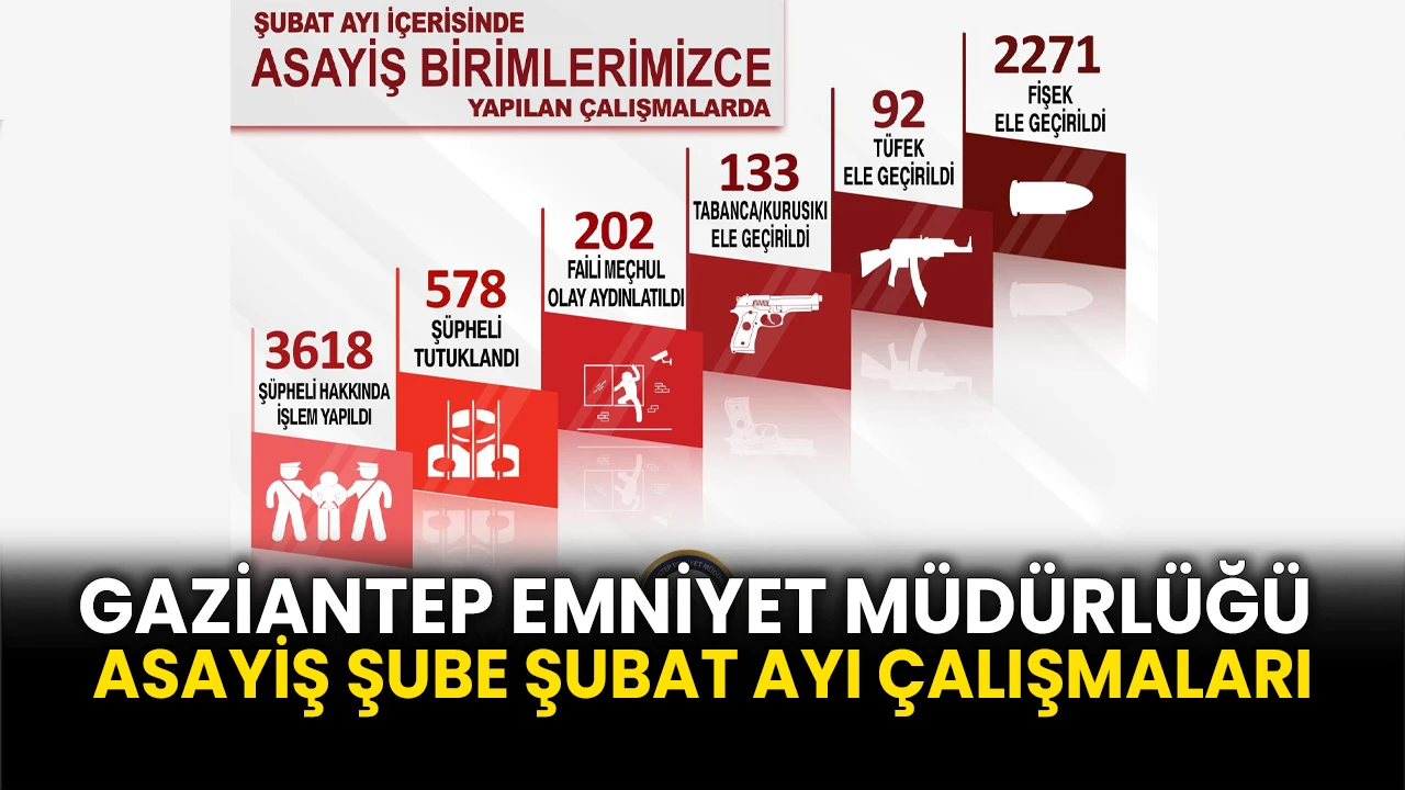 Gaziantep Emniyet Müdürlüğü Asayiş Şube Müdürlüğü ekipleri, Şubat ayı boyunca çeşitli suçlarla mücadele kapsamında yoğun çalışmalar gerçekleştirdi. Bu çalışmalar sonucunda, çeşitli suçlardan aranan 3.618 şüpheliden 578 tutuklandı. Ayrıca, 202 faili meçhul olayı aydınlatıldı ve yapılan aramalarda 133 adet ruhsatsız tabanca ve kurusıkı tabanca, 92 adet ruhsatsız tüfek, 99 adet ve 2.271 adet fişek ele geçirildi