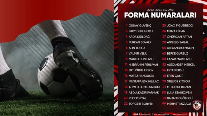 Gaziantep Futbol Kulübü, Spor Toto Süper Lig 2022-2023 sezonun takım kadrosunda yer alacak futbolcuların forma numaralarının belirlendiğini açıkladı. Yapılan açıklamaya göre, takımdaki futbolcular ile forma numaraları; "1 Günay Güvenç, 3 Papy Djilobodji, 4 Arda Kızıldağ, 5 Furkan Soyalp, 6 Alın Tosça, 7 Valmir Veliu, 8 Marko Jevtovic, 11 H. İbrahim Pehlivan, 15 Ertuğrul Ersoy, 17 Mustafa Eskihellaç, 16 Matej Hanousek, 18 Ahmed El Messaoudi, 19 Abdulkadir Parmak, 20 Recep Niyaz, 22 Torgeir Borven, 25 Joao Figueiredo, 26 Mirza Cihan, 27 Ömürcan Artan, 28 Angelo Sagal, 44 Alexandru Maxim, 45 Berke Gürbüz, 50 Lazar Markovic, 52 Alexander Merkel, 54 Erten Ersu, 61 Eren Çakır, 70 Stelios Kitsiou, 71 M. Burak Bozan, 80 Luka Stankovski, 91 Bahadır Gölgeli ve 99 Mehmet Kuzucu" şeklinde sıralandı.
