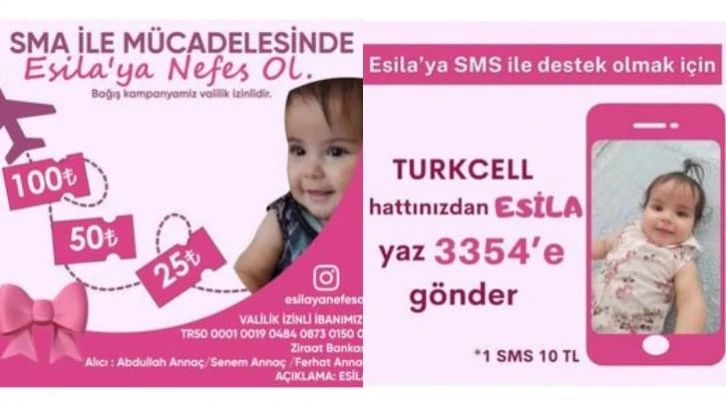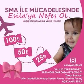Gaziantep'te ikamet eden SMA Tip bir hastası Esila tedavi görmek için yurt dışında bulunan bir tedaviye ihtiyaç duyuyor. İhtiyaç duyulan gen tedavisi sadece Amerika, Dubai ve Macaristan'da yapılırken ailesi hayırseverlerden yardım bekliyor. Su anki durumunda tedavinin başarılı olma oranı yüzde 100 olduğu belirtilirken 10 kilo olan Esila'nın 13 kilo olduğu taktirde ilacı alamayacağı aktarıldı. Babası kilo almaması için için diyet yaptırdığı 10 aylık Esila için Gaziantep ve tüm Türkiye'de vatandaşların yardımlarını bekliyor.