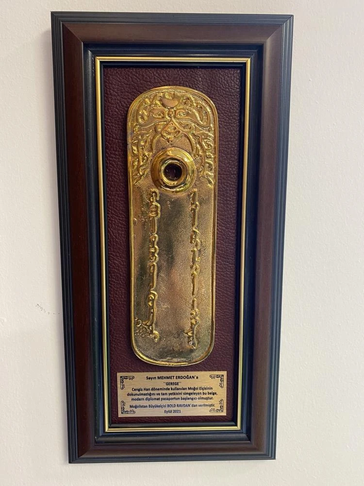 Türkiye’den ayrılmadan önce Türkiye-Moğolistan Parlamentolar arası Dostluk Grubu Başkanı, Gaziantep Milletvekili Mehmet Erdoğan’a teşekkür mektubunu ve CENGİZ Han döneminde kullanılan Moğol Elçisinin dokunulmazlığını ve tam yetkisini simgeleyen modern diplomat pasaportunun başlangıcı olan “Gerege” verdi.