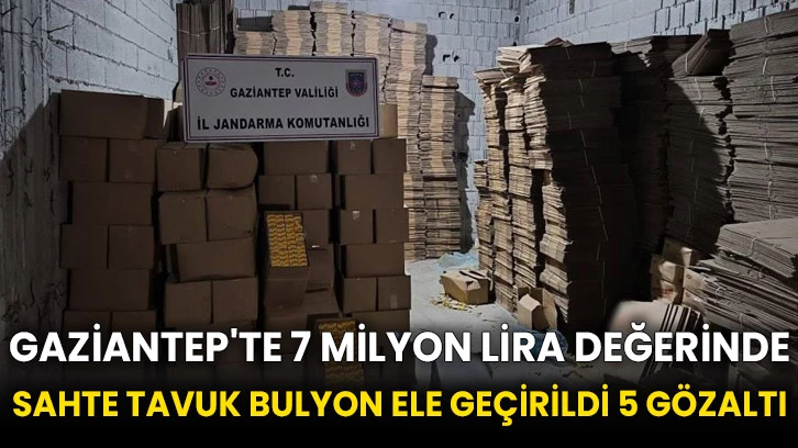 İl Jandarma Komutanlığınca Nizip ilçesinde sahte markalı tavuk bulyon üretimi yapılan bir depoya baskın yapıldı. Depo ve 5 şüpheliye ait araçlarda yapılan aramalarda piyasaya sürülmeye hazır halde piyasa değeri yaklaşık 7 milyon 611 bin TL olan 60 bin 885 adet sahte markalı tavuk bulyon ve 28 bin 232 adet sahte marka ambalajı ele geçirildi. Olayla ilgili M.H., N.H., M.H., S.H. ve H.H. gözaltına alındı. İlçe Tarım ve Orman Müdürlüğü ekipleri numune alarak sahte ürünlere el koyarken şüpheliler hakkında yasal işlem başlatıldı.