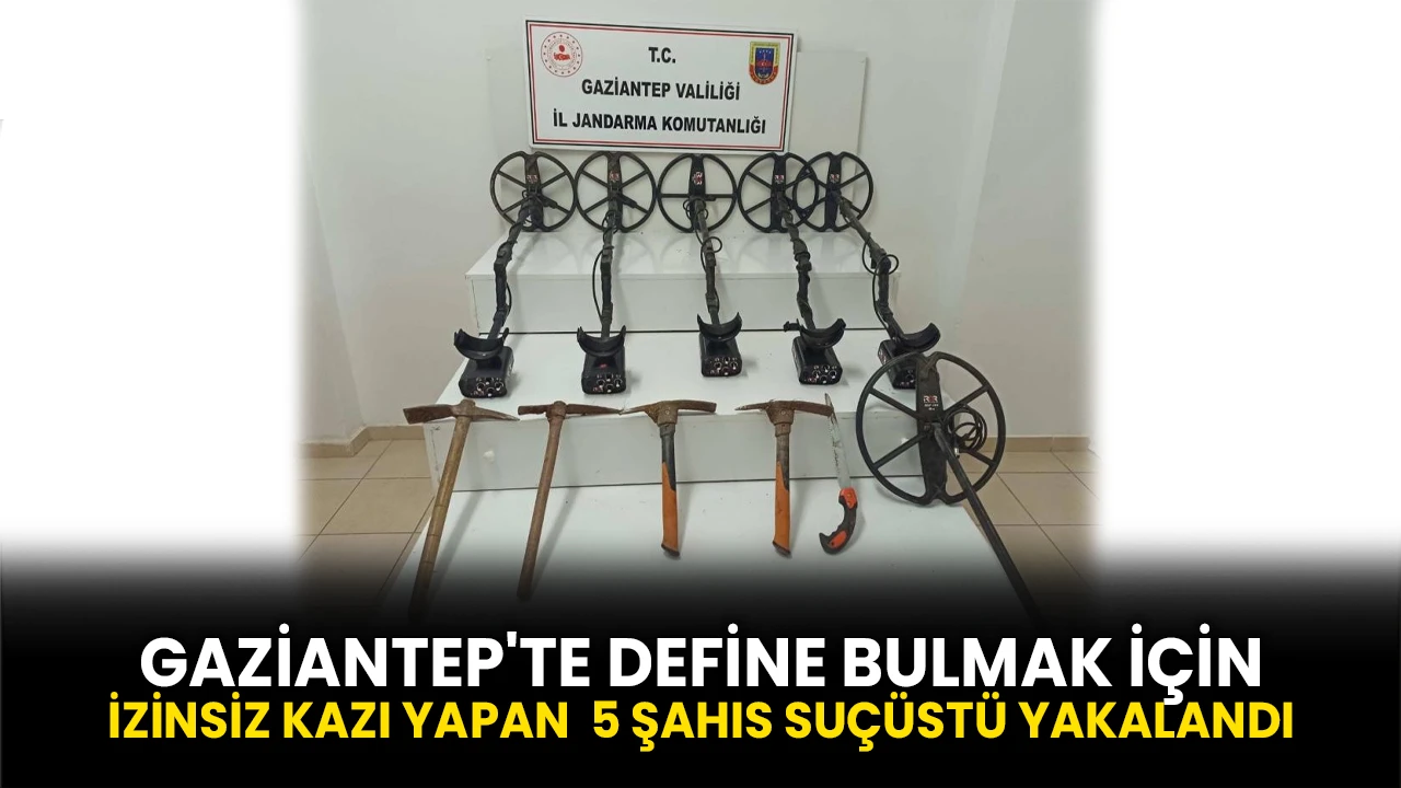 Gaziantep İl Jandarma Komutanlığı ve Cumhuriyet Başsavcılığı koordinesinde tarihi eser kaçakçılığının önlenmesine yönelik çalışma yapıldı. Araban ilçesinde yapılan çalışmalar neticesinde, define bulmak amacıyla izinsiz kazı yaptığı tespit edilen M.G., M.O., M.G., E.Ç. ve M.M.G. isimli 5 şüpheli suçüstü yakalandı. Yapılan aramalarda ise suçta kullanılan dedektör ve kazı malzemeleri ele geçirildi.