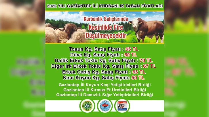 Toplantı sonrası yapılan yazılı açıklamada kurbanlık fiyatlarının belirlenmesinde üretim maliyetlerinin ve halkın alım gücünün göz önünde bulundurulduğu vurgulandı. 2021 yılı Kurban Bayramı'nda Gaziantep’te yaklaşık 69 bin adet küçükbaş kurbanlık ve 12 bin 300 adet büyükbaş kurbanlık kesildiği bilgisinin paylaşıldığı açıklamada, “Toplantıda yapılan değerlendirmeler neticesinde; geçen yıla göre yüzde 150 civarında artan yem maliyetleri, yetiştiricilerin elindeki hayvan sayıları, halkımızın alım gücü, pandemi şartları vb. konular dikkate alınarak kurbanlık satışlarında kesinlikle fire düşülmemesine ve 2022 yılı kurbanlık fiyatlarının aşağıda yazılı olduğu şekilde olmasına ve oy birliği ile karar verilmiştir” denildi.