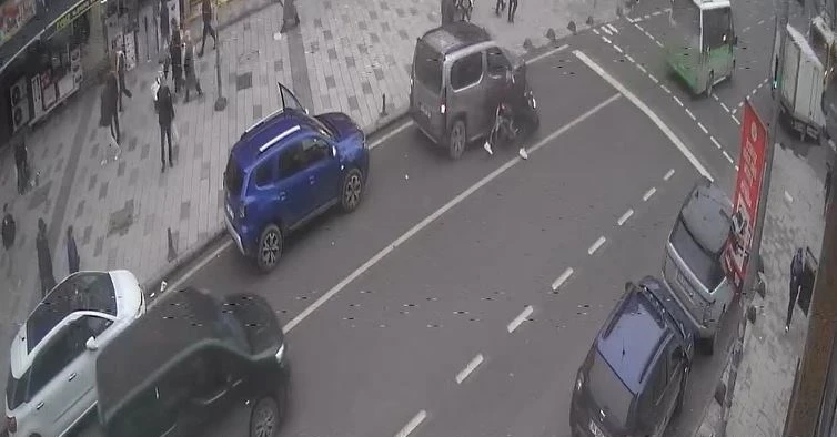 Kaza anı ve yaşanan kovalamaca çevrede bulunan bir iş yerinin güvenlik kamerası tarafından kaydedildi. Görüntülerde motosikletlinin ön kaldırdığı, park halindeki araca çarptığı, yolcunun yere düştüğü ve ardından motosikletlinin kaçtığı anlar net şekilde görüldü.