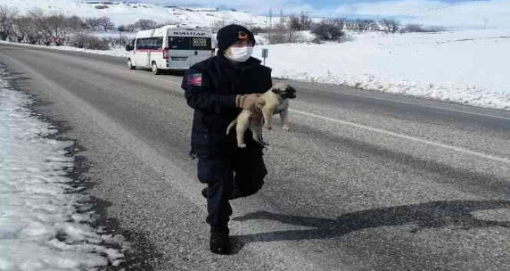 Adıyaman'ın Kahta ilçe Jandarma Karakol Komutanlığı ekipleri tarafından yol kenarında soğuktan bitkin halde bulunan yavru köpek, veteriner müdürlüğüne teslim edildi.
