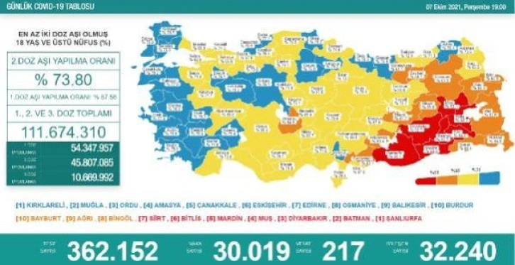 18 yaş ve üzeri nüfusun aşılanması verilerinde 1'inci doz Türkiye ortalaması yüzde 87,56, 2'nci doz ortalaması yüzde 73,80 olarak ölçüldü. Ayrıca, 1'inci dozda 54 milyon 347 bin 957, 2'nci dozda 45 milyon 807 bin 85 ve 3'üncü dozda 10 milyon 669 bin 992 olmak üzere toplam 111 milyon 674 bin 310 aşı uygulandı.En az 2 doz aşı olmuş kişi oranının en yüksek olduğu iller; Kırklareli, Muğla, Ordu, Amasya, Çanakkale, Eskişehir, Edirne, Osmaniye, Balıkesir ve Burdur olurken 2 doz aşı olmuş kişi oranının en az olduğu iller ise Bayburt, Ağrı, Bingöl, Siirt, Bitlis, Mardin, Muş, Diyarbakır, Batman ve Şanlıurfa oldu.'SAYILAR KEŞKE YETERİNCE HİSSEDİLEBİLİR OLSA'Sağlık Bakanı Fahrettin Koca, Twitter hesabından yaptığı açıklamada, "217 sayısını anlamak, her gün yeni kayıplar veriyoruz. Kimi torunlarını sevmeye doyamamış bir büyükanne, kimi ailesi için hayalleri olan bir baba, kimi doğumu bekleyen bir anne. Tablolardaki sayılar keşke yeterince hissedilebilir olsa. Birbirimizi anlayıp dayanışma içinde olalım" dedi.