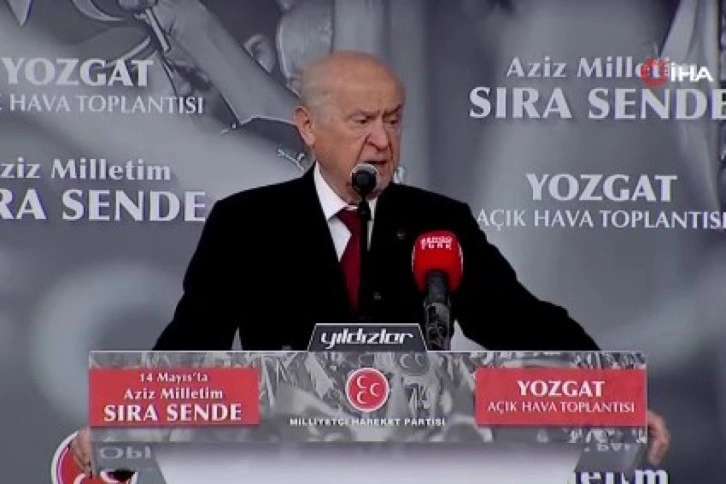 Milliyetçi Hareket Partisi (MHP) Genel Başkanı Devlet Bahçeli, Çorum'un ardından Yozgat Cumhuriyet Meydanı'nda “14 Mayıs'ta Aziz Milletim Sıra Sende” temalı mitinginde vatandaşlara seslendi. Millet İttifakı ve cumhurbaşkanı adayı Kılıçdaroğlu'nu hedef alan MHP lideri Bahçeli, “Milli umutları karartmak isteyen siyasi partiler zillet ittifakında toplanmıştır. Gerçekler ortadadır ve inkarı mümkün değildir. Önce sipariş bir masa kurdular, sonra altı parti o masaya oturdu, masanın altında gizli gizli ele ele tutuşup sakladıklarını da sonunda gün yüzüne çıkardılar. Bizim için malum olanı tescillediler. CHP ile PKK aynı masadadır. FETÖ masanın gözcüsüdür. CHP ile HDP aynı kanlı masanın paydaşıdır. İYİ Parti'yle HDP ve PKK bir elmanın iki yarısı neyse geldiğimiz bu aşamada aynısıdır. Kılıçdaroğlu'na kazanamayacak aday dediler. Masada kriz çıkardılar. Bir oturup bir kalktılar, bir küsüp bir barıştılar. Birbirlerine oyun oynadılar. Milletimizi aldatmak istediler. Adına strateji dediler, kazanamayacak adayı kazandırmak için masadan kalktık dediler. Sonra tutup iki büyükşehir belediye başkanını müstakbel Cumhurbaşkanı yardımcısı olarak takdim ettiler. Gün aşırı Cumhurbaşkanı yardımcısı sayısını artırdılar, hatta hızlarına hiç kimse yetişemedi. Önlerine kim geldiyse olmayan makamları dağıttılar. Sabah ilk kalkanı Cumhurbaşkanı yardımcısı yapacağız dediler. Siyaseti mal pazarına çevirdiler, pazarlıkları kızıştırdılar. Güçlendirilmiş Parlamenter Sistem vaadinden sayısı güçlendirilmiş Cumhurbaşkanı yardımcılığına dönüş yaptılar. Bu dönüşü yaparken de elleriyle kalp işareti yaptılar. Halbuki kalp işarette değil iradededir. Kalp işarette değil itibardadır. Kalpleri kaskatı kesilmiş olan zillet parti başkanlarının yaptıkları kalp işaretinin muhatabı PKK'dır, FETÖ'dür, Türk ve Türkiye düşmanlarıdır. Kalbi vatan sevgisiyle çarpan hiçbir vatandaşımız bu ucube siyasetçilere inanmaz, değer vermez, vermeyecektir.” dedi.
