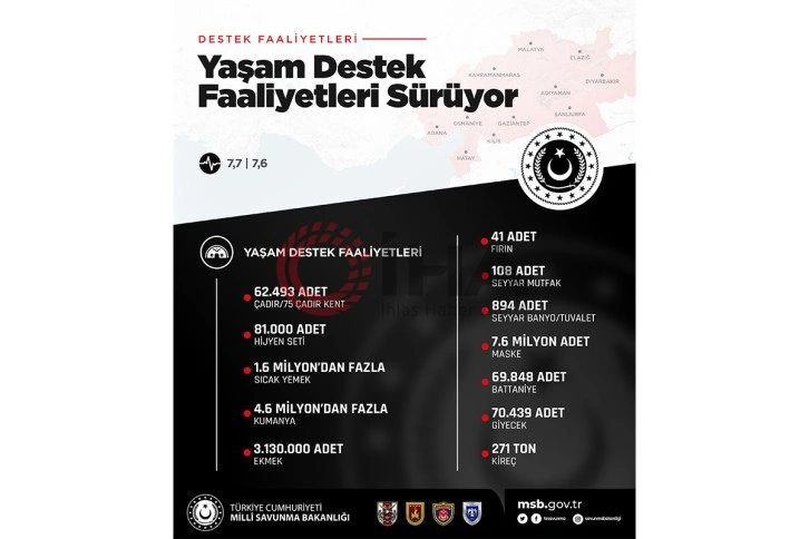 Milli Savunma Bakanlığı (MSB), merkez üssü Kahramanmaraş'ın Pazarcık ve Elbistan ilçeleri olan ve 11 ili etkileyen "asrın felaketinin" hemen ardından sahada icra ettiği faaliyetlerine aralıksız devam ediyor. MSB yaşam destek faaliyetleri kapsamında 75 çadır kentte 62 bin 493 çadır, 81 bin hijyen seti, 1,6 milyondan fazla sıcak yemek, 4,6 milyondan fazla kumanya, 3 milyon 130 bin ekmek, 7,6 milyon adet maske, 69 bin 848 adet battaniye ve 70 bin 439 adet giysi ihtiyacı temin edildi.