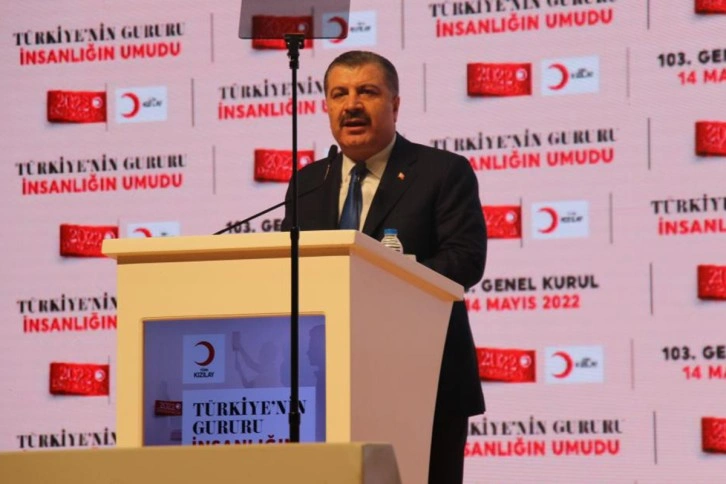 Türk Kızılay'ın 103. Genel Kurulu'na katılarak burada bir konuşma gerçekleştiren Bakan Koca, Türk Kızılay'ın toplumla bütünleştiğini, hem toplumun geleceğine sahip çıkan hem de toplumun sahip çıktığı bir STK haline geldiğini söyledi.“Kan ihtiyacı olan her hastamıza Kızılay'ın eli uzanmaktadır”Savaş ve afetlerin vurduğu her bölgede tüm olumsuz koşullara rağmen Kızılay bayrağının dalgalandığının görüldüğünü hatırlatan Sağlık Bakanı Koca, “Bugün hızla gelişen sağlık sistemimizde kan ihtiyacı olan her hastamıza Kızılay'ın eli uzanmaktadır. Türk Kemik İliği ve Kök Hücre Bankası, Bakanlığımız, Kızılay iş birliğiyle yürütülmektedir. Sadece ülkemizde, komşu ülkelerde değil, sıkıntıya düşen kişilerin, mazlumların, mağdurların, ilk aradığı şeyin Kızılay amblemi olduğuna şahit olursunuz. Gönül coğrafyamızın yanı sıra savaş ve afetlerin vurduğu tüm bölgelerde, tüm olumsuz koşullara rağmen Kızılay bayrağının dalgalandığını görürsünüz. Kızılay ambleminin orada olması, onlara bir dost elinin uzandığı anlamına geliyor. Karınlarını doyurabilmeleri için ihtiyaç duydukları yemeği, barınabilmeleri için gereken çadırın, kendilerini soğuktan koruyacak battaniyenin bulunduğu anlamına geliyor” diye konuştu.