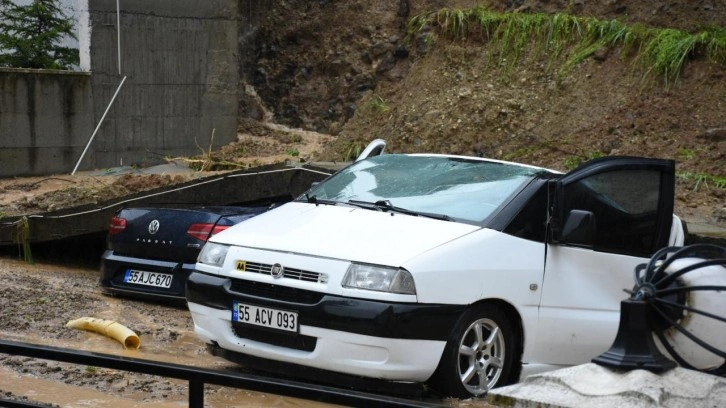 Samsun'un Canik ilçesinde şiddetli yağışın etkili olduğu kentte, Uludağ Mahallesi Mahmudiye Caddesi'nde bir apartmanın otoparkının istinat duvarı çöktü.
