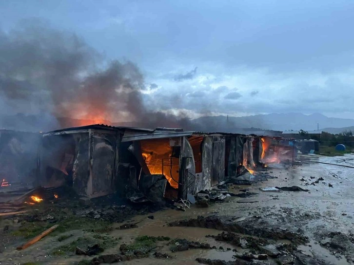 Hatay’ın Defne ilçesinde şantiyede çıkan yangında işçilerin kaldığı 15 konteyner kullanılamaz hale geldi. Yangın itfaiye ekiplerinin müdahalesiyle söndürülürken, konteynerlerin yandığı anlar cep telefonu kamerasına yansıdı.