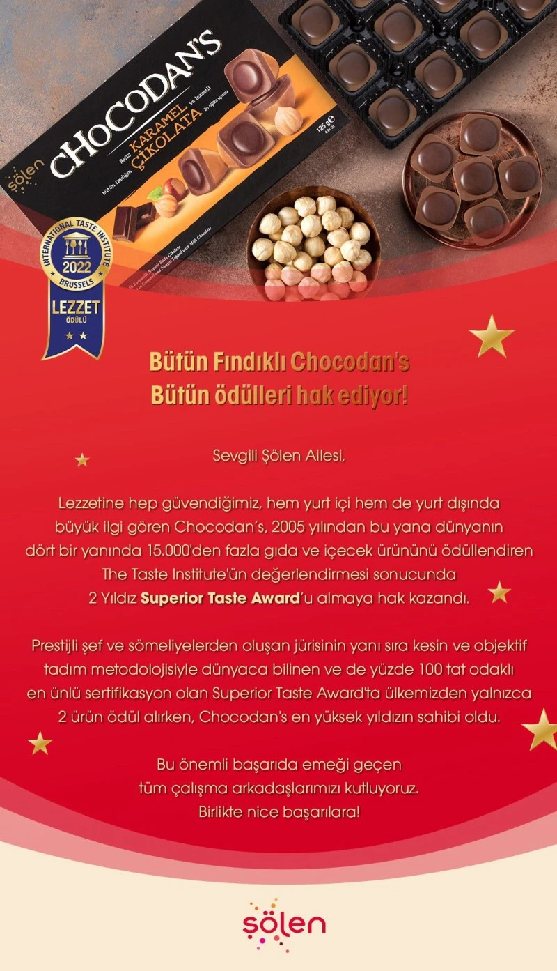 Hem yurt içinde hem yurt dışında büyük ilgi gören Şölen Chocodan’s (çikolata) 2005 yılından bu yana dünyanın dört bir yanında 15.000’den fazla gıda ve içecek ürününü ödüllendiren The Taste İnstitute’ün değerlendirmesi sonucunda 2 yıldız ile Superior Taste Award’u aldı.