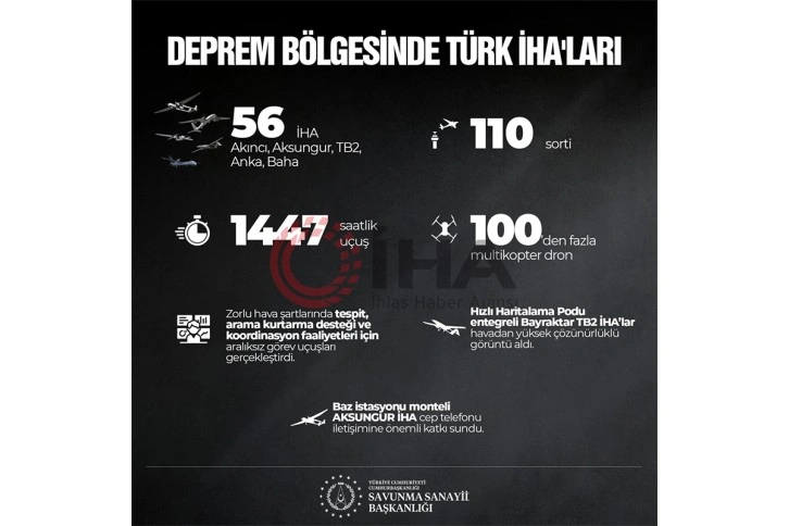 Merkez üssü Kahramanmaraş olan ve 10 ili etkileyen 7,7-7,6 büyüklüğündeki depremlerin ardından Türk İHA'lar havadan arama-kurtarma çalışmalarına destek için aralıksız görev yaptı. SSB sosyal medya hesabı üzerinden yaptığı paylaşımda, 56 adet İHA'nın (Akıncı, Aksungur, TB2, Ankara ve Baha), toplamda bin 447 saatlik uçuş, 110 sorti, 100 den fazla multikopter dronun zorlu hava şartlarında tespit arama kurtarma desteği ve koordinasyon faaliyetleri için aralıksız görev uçuşları gerçekleştirdiği belirtildi. Ayrıca Hızlı Haritalama Podu entegreli Bayraktar TB2 İHA'lar havadan yüksek çözünürlüklü görüntü aldı. Baz istasyonu monteli Aksungur İHA cep telefonu iletişimine önemli katkı sundu.