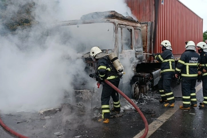 Yangın, TEM Otoyolu Yeşilyayla mevkiinde meydana geldi. Edinilen bilgiye göre, Ankara'dan yüklediği beyaz eşyaları Kocaeli'nin Dilovası ilçesinde bulunan limana götüren Mehmet A. idaresindeki 34 TJ 7193 plakalı tır, otoyolda ilerlerken Yeşilyayla mevkiinde bilinmeyen bir sebeple alev aldı. Alevleri gören otoyoldaki diğer sürücüler tır sürücüsü Mehmet A.'yi uyardı. Tırı emniyet şeridinde çeken sürücü Mehmet A., itfaiye ekiplerinden yardım istedi. Olay yerine gelen Düzce Belediyesi İtfaiye Müdürlüğü ekipleri, alevlere müdahale ederek, yangını kısa sürede kontrol altına aldı.