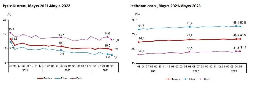 İstihdam edilenlerin sayısı 2023 yılı Mayıs ayında bir önceki aya göre 63 bin kişi artarak 31 milyon 716 bin kişi, istihdam oranı ise değişim göstermeyerek %48,5 oldu. Bu oran erkeklerde %66,0 iken kadınlarda %31,4 olarak gerçekleşti.